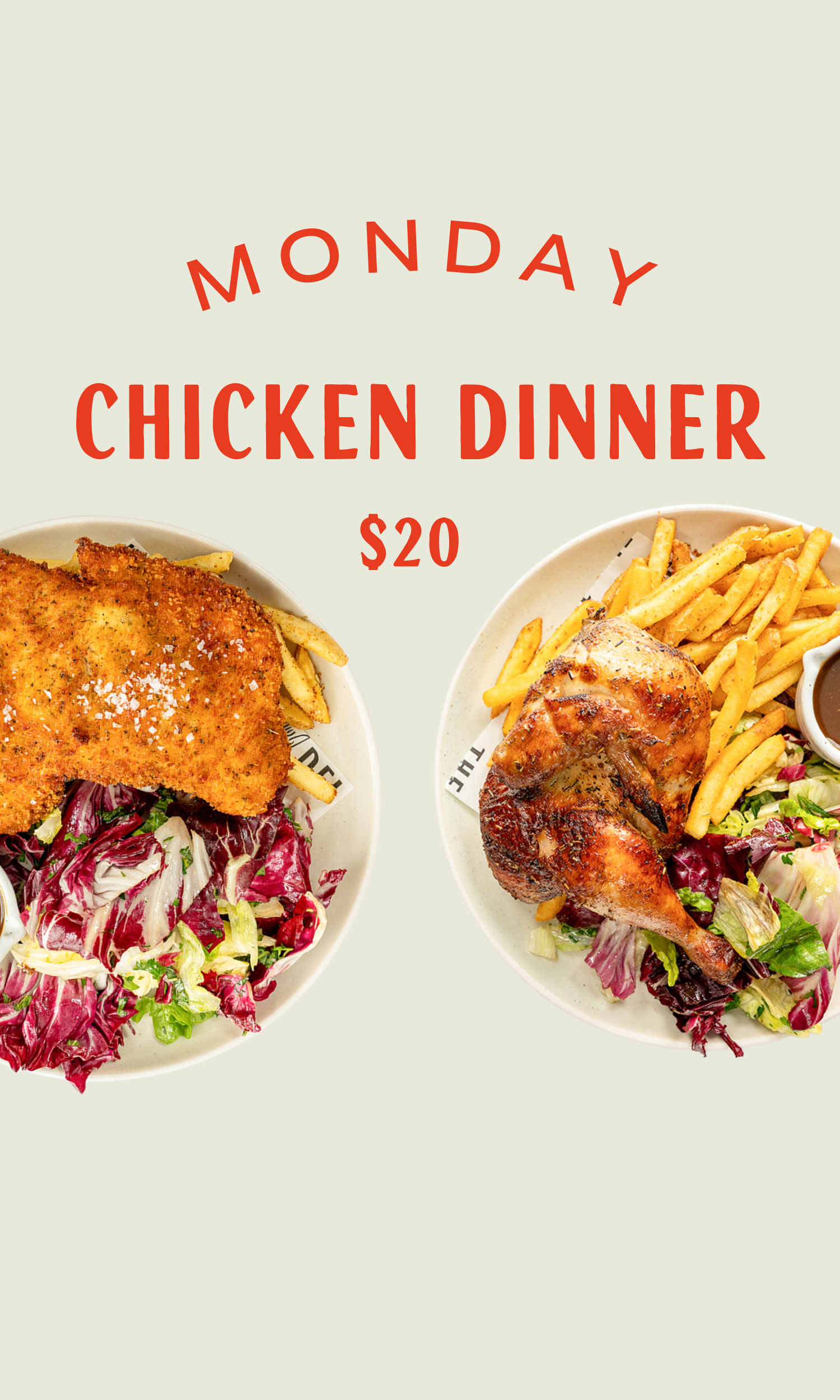 The Del’s Monday night special in Newcastle — a $20 Chicken Dinner featuring your choice of golden, crispy Chicken Schnitzel or our signature Rotisserie Half Chicken. Served fresh and hearty, it’s the perfect pub meal to start your week right.