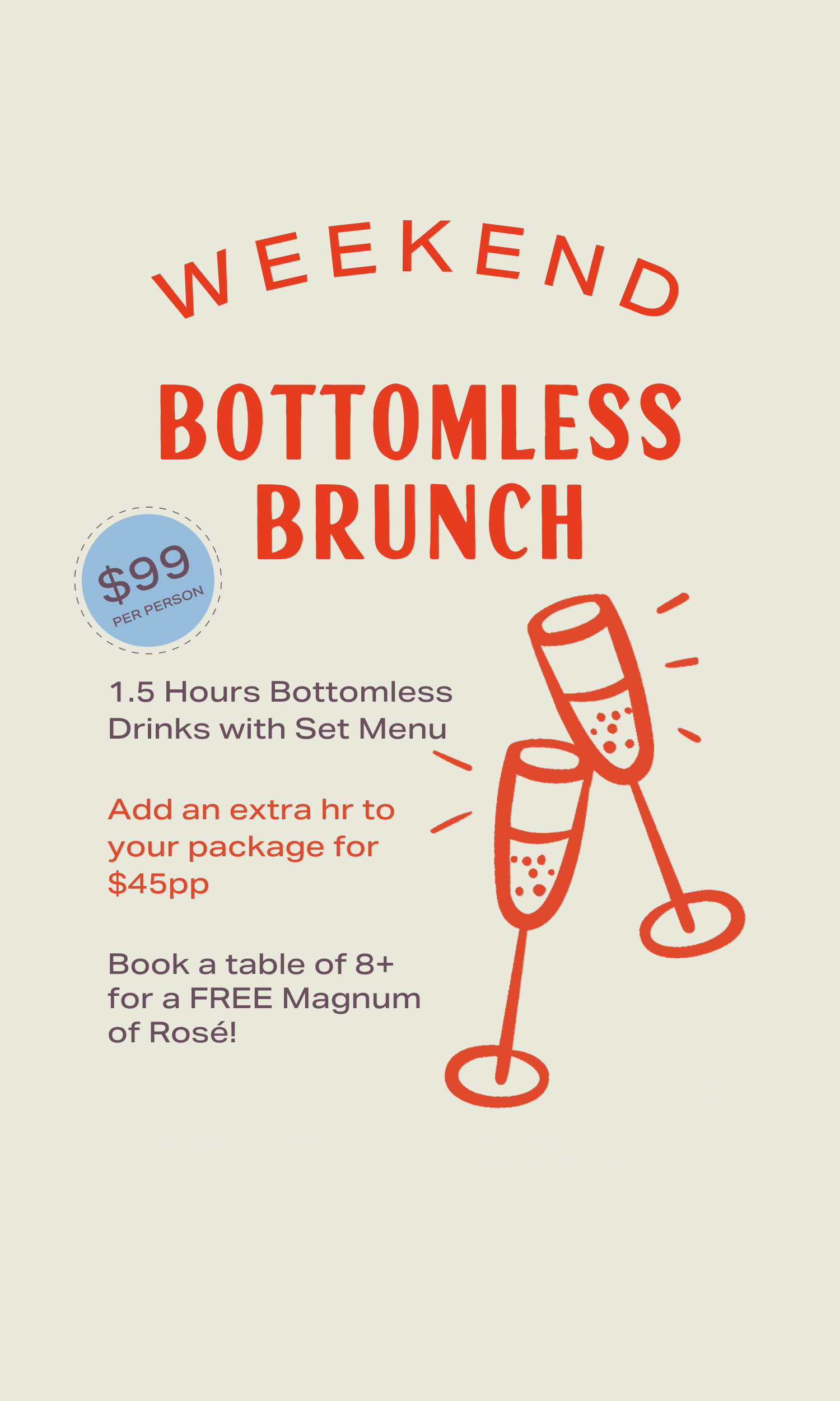 From Dec 24 – Jan 4 (excluding Christmas Day), enjoy 90 minutes of bottomless drinks paired with our Bottomless set menu, running daily at 12PM & 2PM. Gather your friends, family, or holiday crew and celebrate the silly season — bookings required, spots are limited.