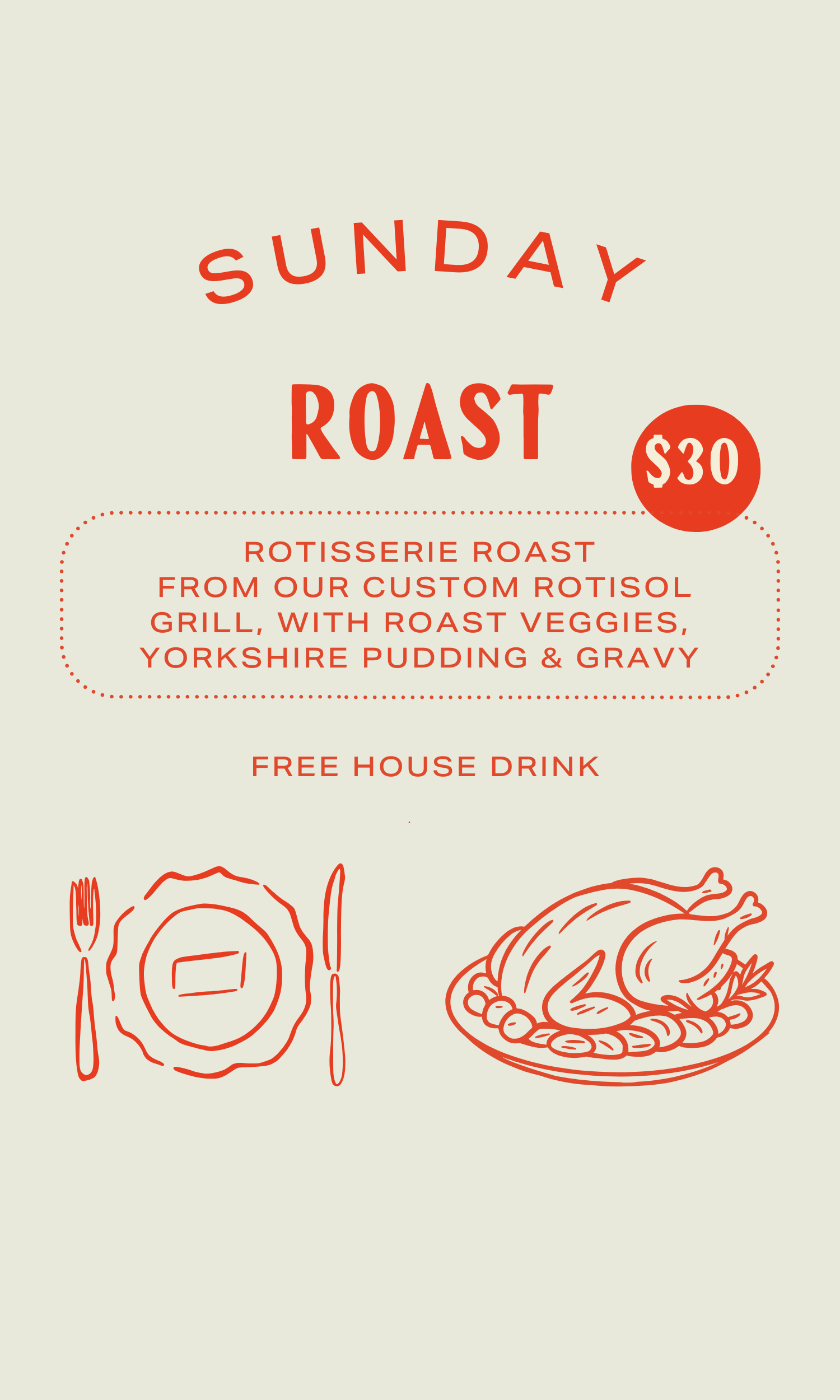 Sunday roast at The Del Newcastle with succulent free-range rotisserie chicken, roast vegetables, golden Yorkshire pudding, savoury gravy, and a free house drink for $30 — the ultimate Sunday pub dinner