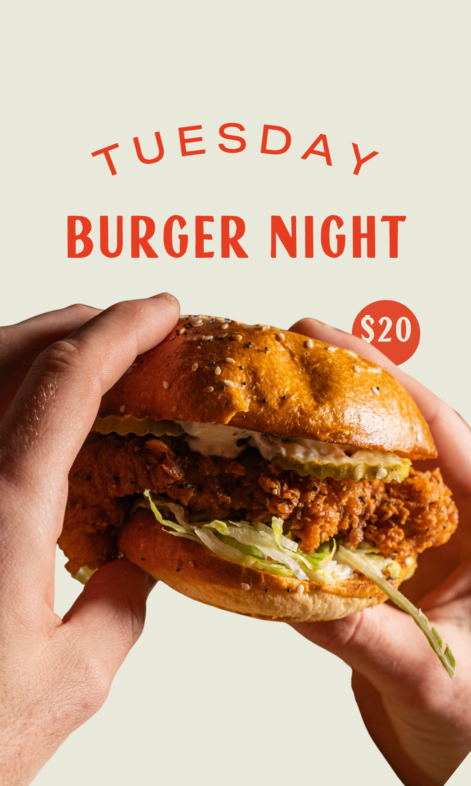 Indulge in Tuesday Burger Night at The Del Newcastle — juicy fried chicken or beef burgers stacked with fresh ingredients and served with crispy fries for just $20. A local favourite pub special perfect for casual midweek dining.