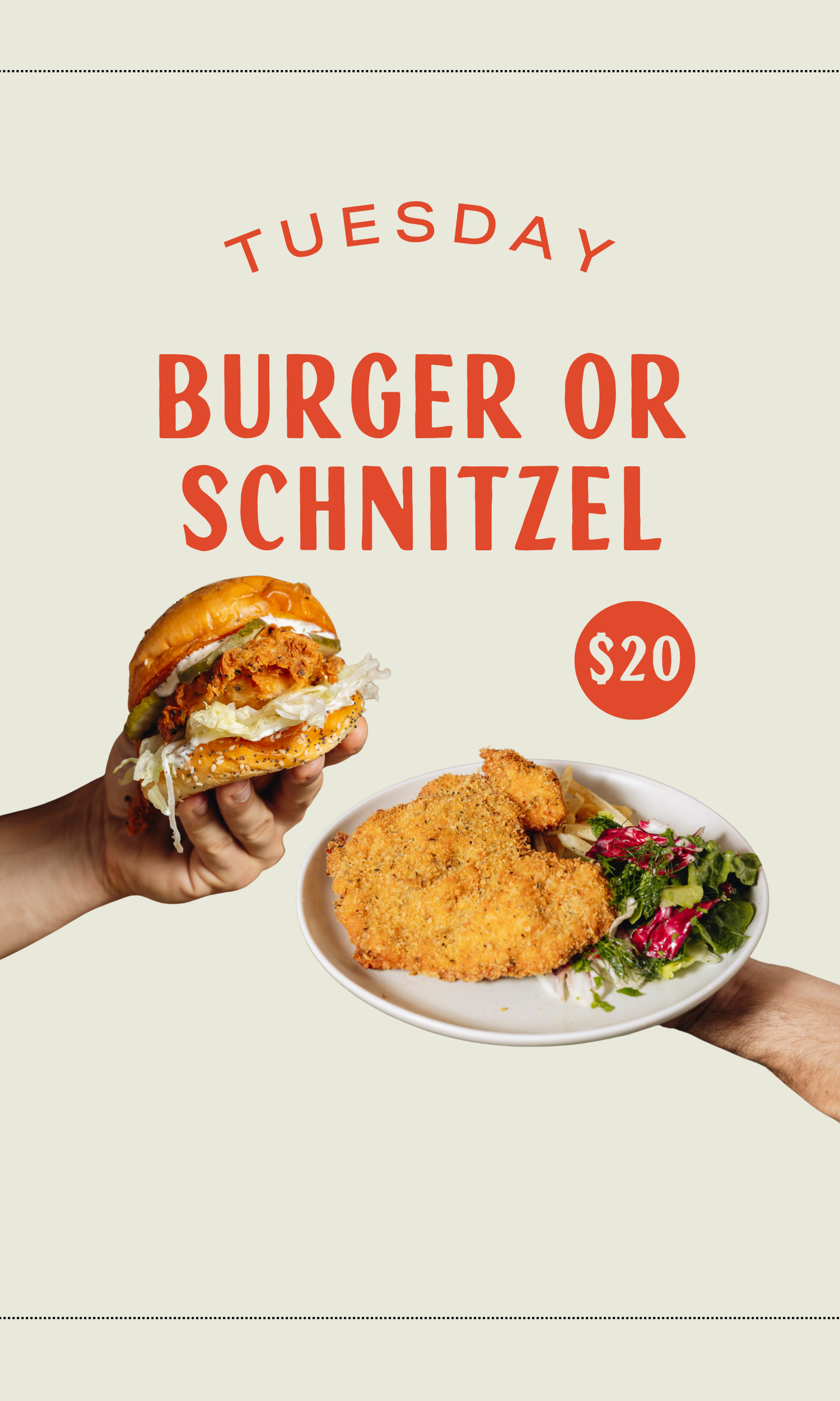 Choose from our crispy, golden schnitzels or juicy, flavour-packed burgers, all made with quality ingredients and served fresh in the heart of Cooks Hill. Whether you’re after a classic pub-style schnitty or a stacked burger with all the extras, we’ve got your Tuesday cravings covered.