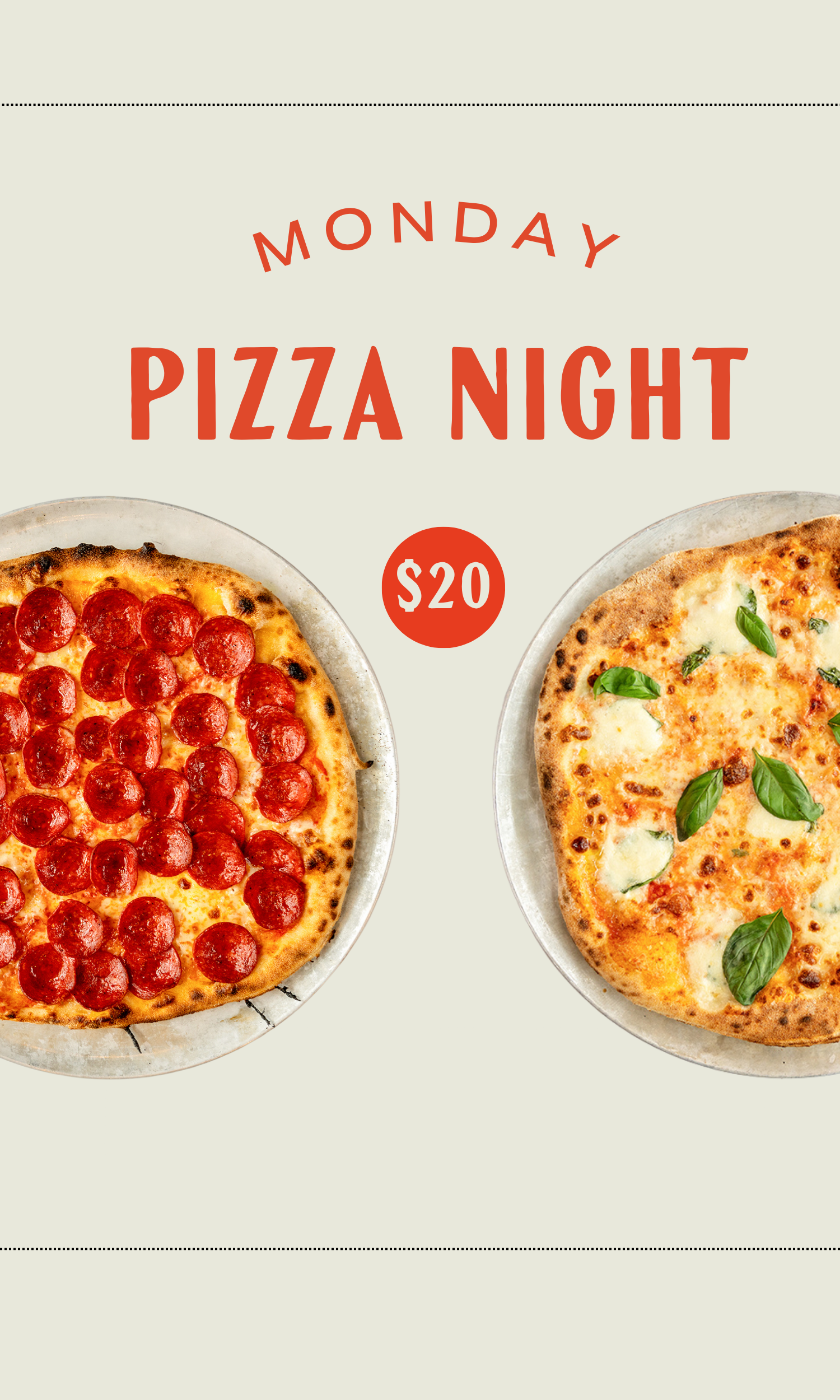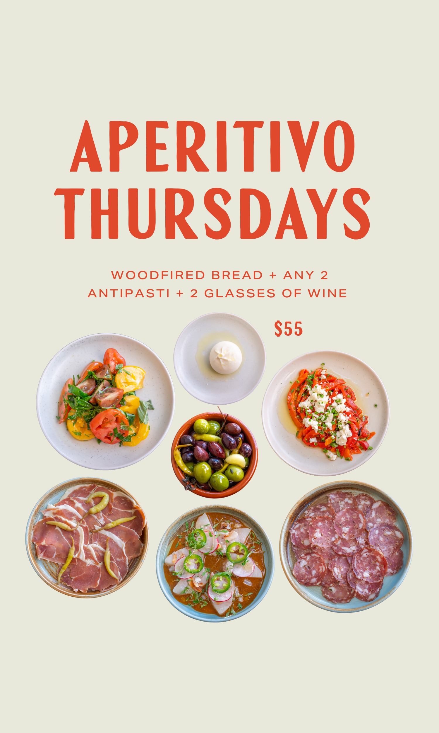 Aperitivo Thursdays. Every Thursday, enjoy our famous woodfired bread, any two Antipasti, and two glasses of wine for $55 — or upgrade to two spritz for $59. The perfect way to wind down.